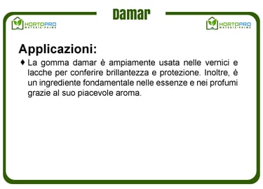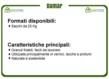 Conosciuta anche come Damar Mata Kuching, questa gomma è una resina naturale proveniente dagli alberi Damar, coltivati principalmente in Indonesia (Sumatra e Borneo). I granuli di gomma damar hanno un colore giallo avorio pallido e un odore piacevole. Viene raccolta tramite incisioni nel tronco degli alberi e utilizzata soprattutto nelle vernici, lacche e essenze aromatiche.